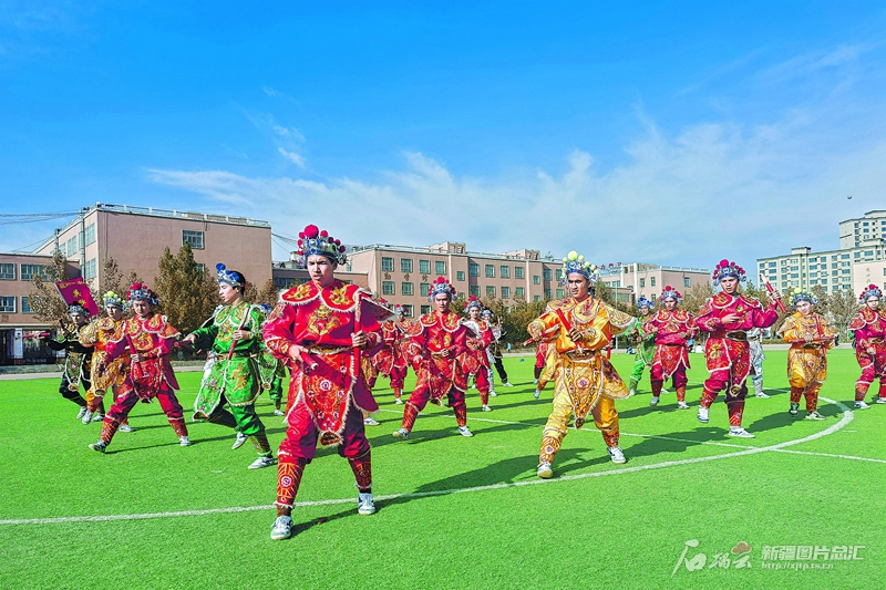 在疏附县第二中学操场上,少年们手执双槌,踩着鼓点翻飞跳跃,动作行云流水。