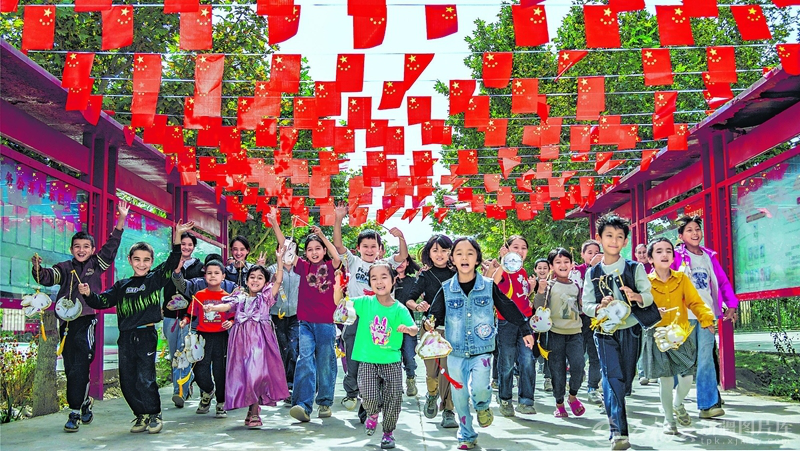 9月20日,孩子们在泽普县古勒巴格乡胜利村村委会大院展示手工作品。为庆祝自治区成立70周年,泽普县文化体育广播电视和旅游局驻该村工作队联合村“两委”开展了形式多样的活动,让村民们在活动中表达对祖国的感恩、对家乡的祝福。□张昀摄