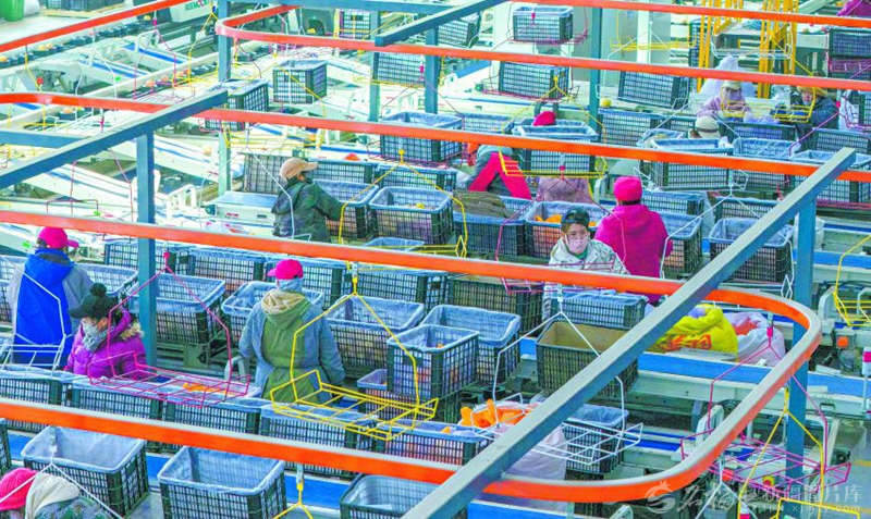 1月16日,工作人员在泽普县润泽农业产业发展有限公司智能分选设备前作业。该公司在戈壁滩上建起2万亩有机苹果栽培基地,构建种植、采摘、包装、销售一体化产业链,创新推出“订单农业+数字化供应链”模式,推动当地苹果产业规模化、标准化、品牌化发展。□张昀摄