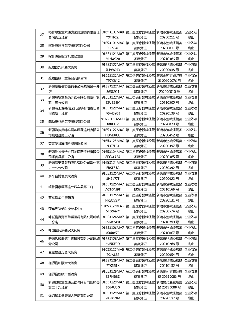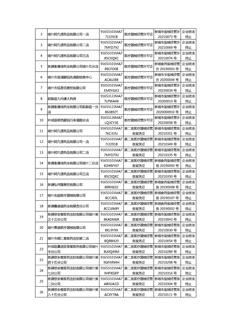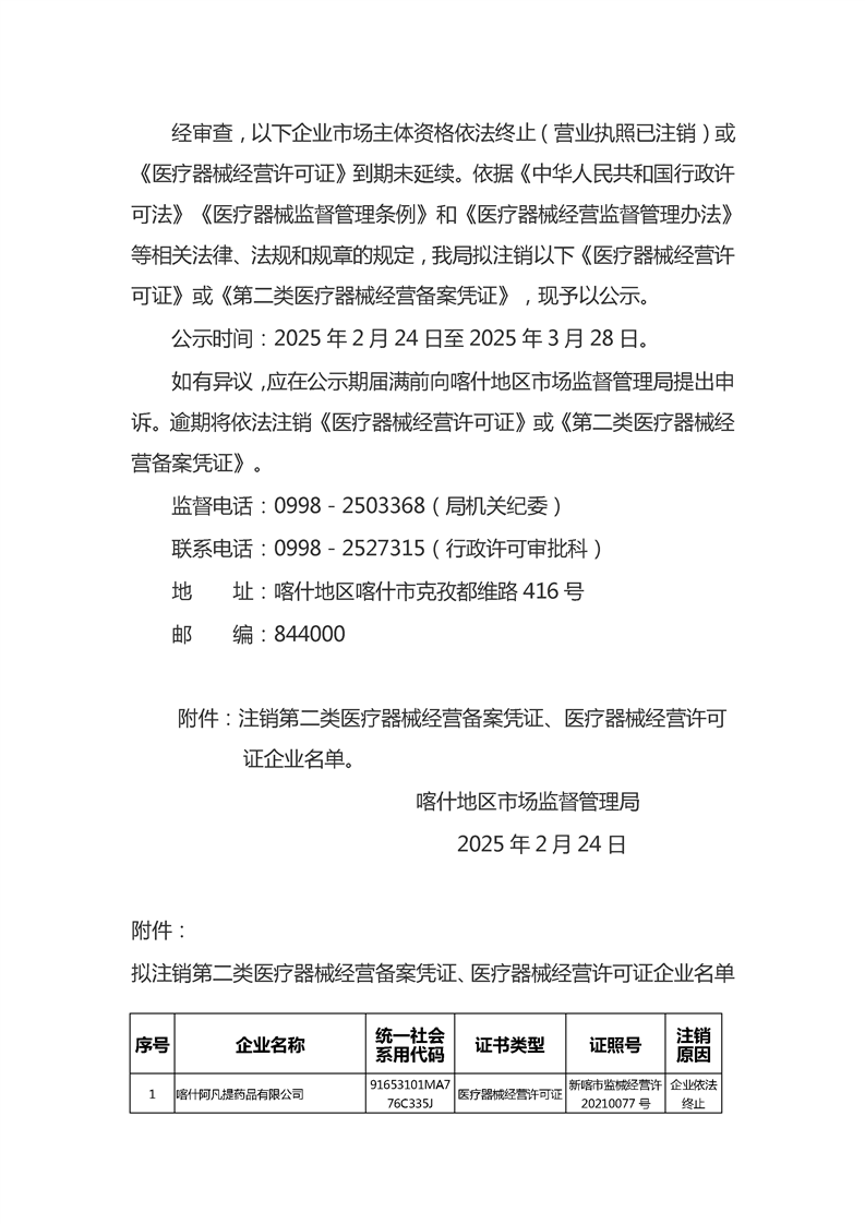 喀什地区注销《医疗器械经营许可证》《第二类医疗器械经营备案凭证》的公示(2025年第一批)