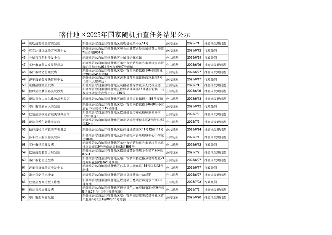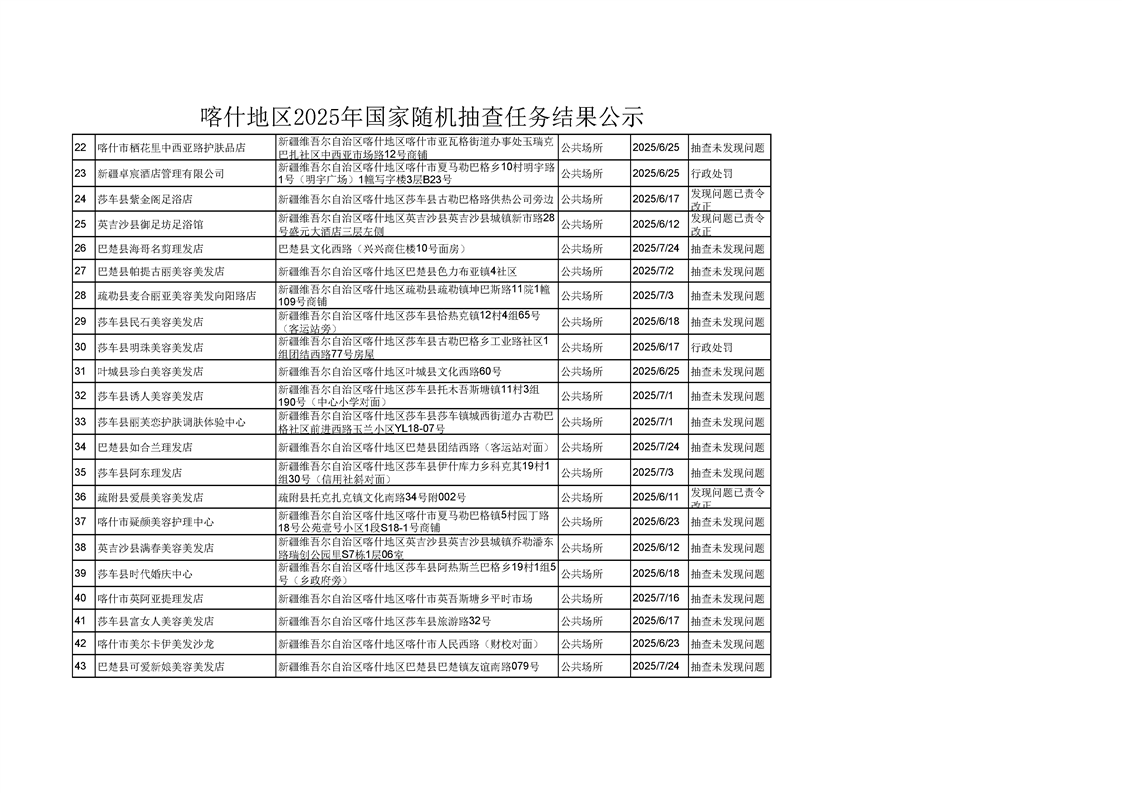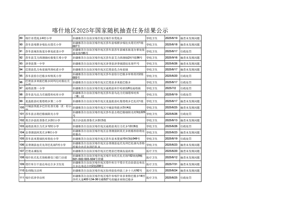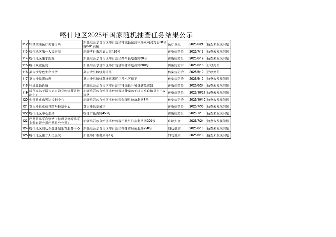 喀什地区2025年国家随机抽查任务结果公示