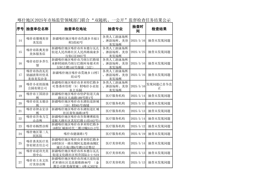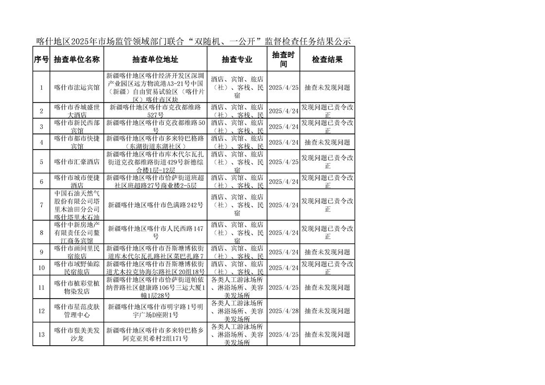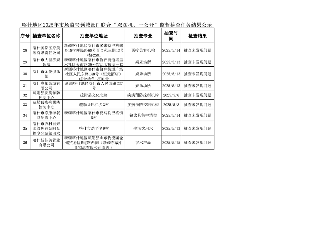 喀什地区2025年市场监管领域部门联合“双随机、一公开”监督检查任务结果公示