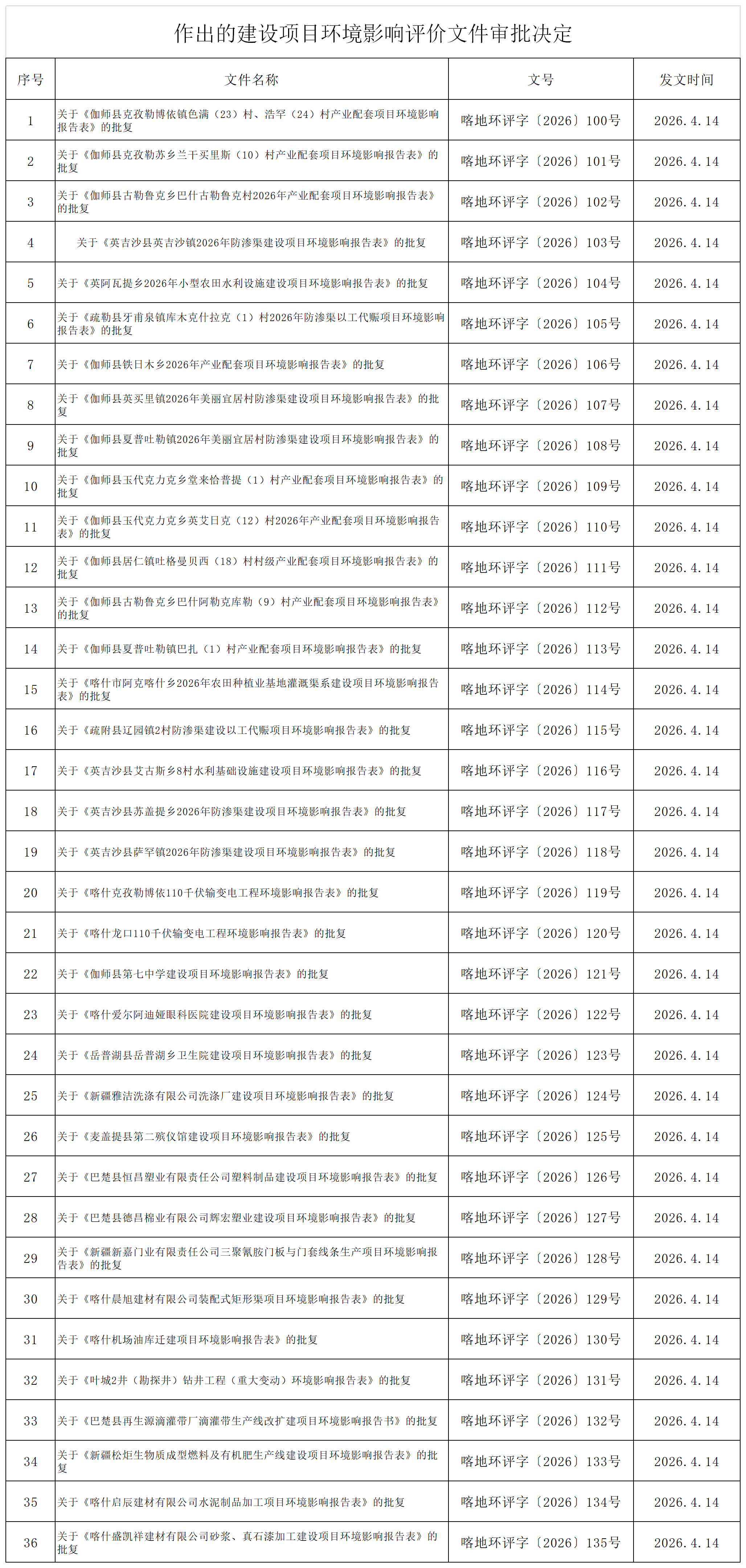 根据建设项目环境影响评价审批程序有关规定,经审查,2026年4月20日我局对36个建设项目环境影响评价文件作出审批决定。现将作出的审批决定予以公示,公示期为于2026年4月20日-2026年4月29日(7个工作日)。