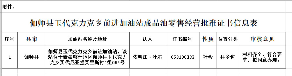附件:伽师县玉代克力克乡前进加油站成品油零售经营批准证书信息表