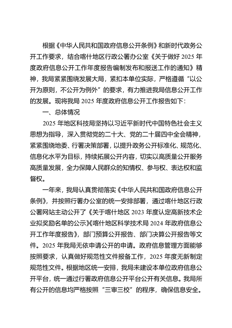 喀什地区科学技术局2025年政府信息公开工作年度报告