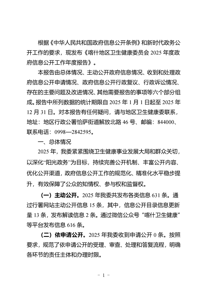 喀什地区卫生健康委员会2025年度政府信息公开工作年度报告