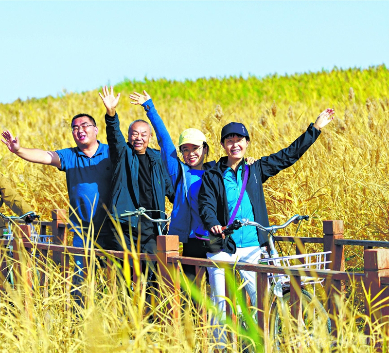 9月17日,游客在乌鲁木齐柴窝堡湖国家湿地公园游玩。秋色正浓,该湿地公园进入最佳观赏期,吸引游客前来感受自然之美。□石雪摄