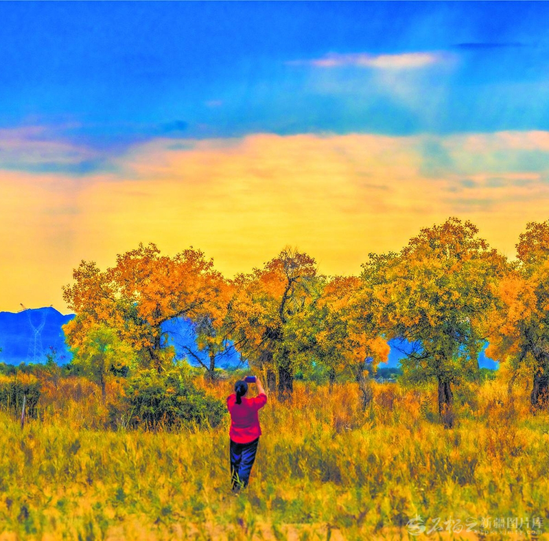 9月17日,游客在克拉玛依市乌尔禾区白杨河胡杨林拍摄。傍晚,金色云霞给胡杨林披上了一层梦幻的光彩,吸引着众多游客前来观赏。□田国建摄