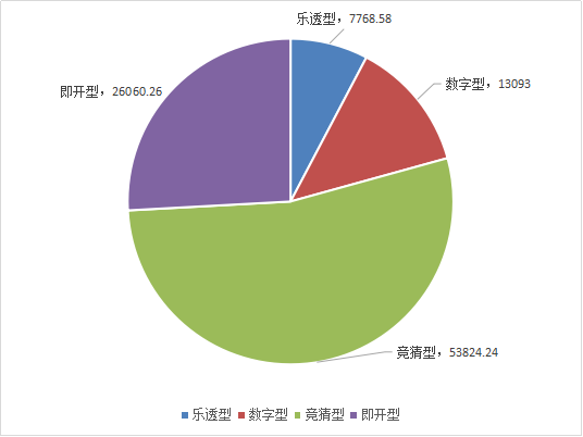 体育彩票销量100746.08万元,分种类其中:乐透型销量为7768.58万元;数字型销量为13093万元;竞猜型销量为53824.24万元;即开型销量为26060.26万元。