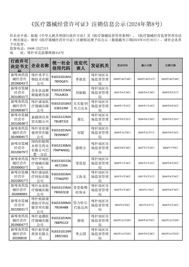 经企业申请,依据《中华人民共和国行政许可法》及《医疗器械监督管理条例》、《医疗器械经营监督管理办法》相关规定,现对《医疗器械经营许可证》注销情况现予以公示(数据截至日期2024年10月30日),请社会各界予以监督。 监督电话:0998-2527315 |
