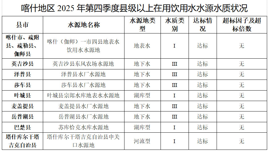 附件:喀什地区2025年第四季度县级以上在用饮用水水源水质状况