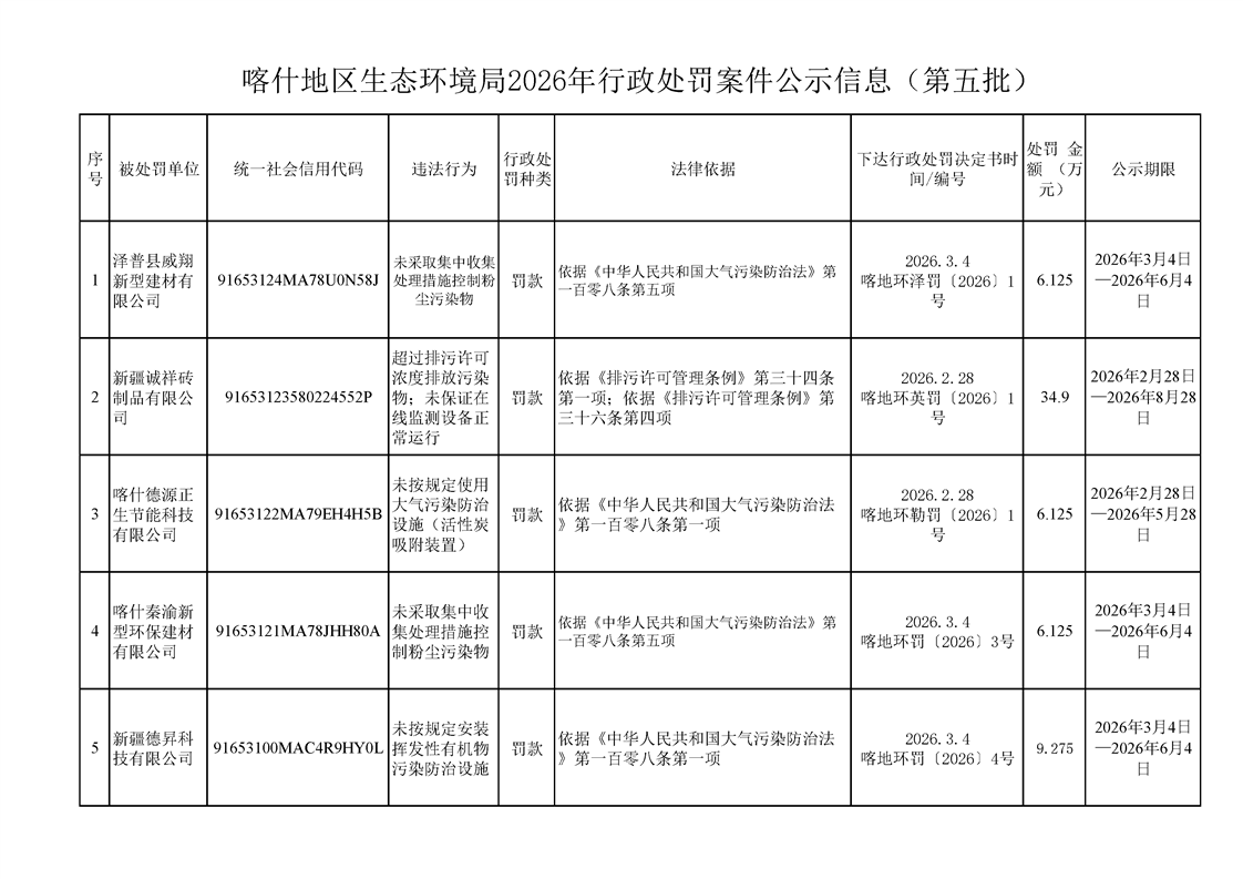 喀什地区生态环境局2026年行政处罚案件公示信息(第五批)