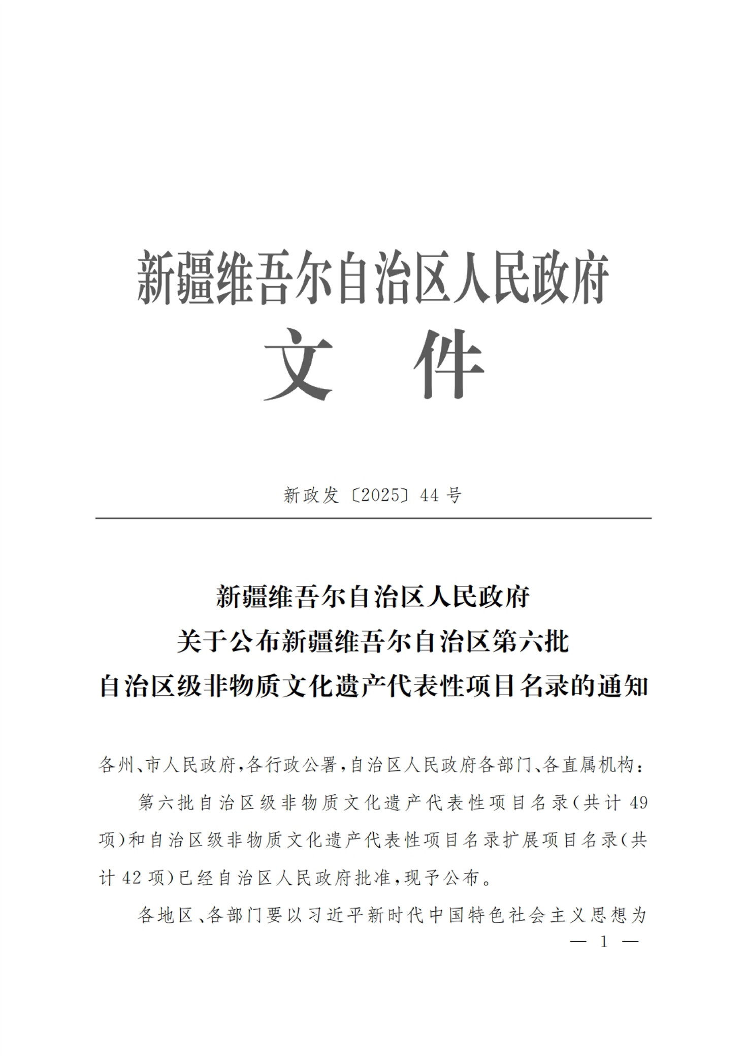 新疆维吾尔自治区人民政府关于公布新疆维吾尔自治区第六批自治区级非物质文化遗产代表性项目名录的通知