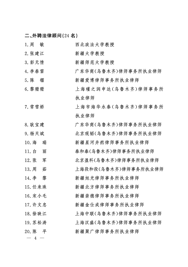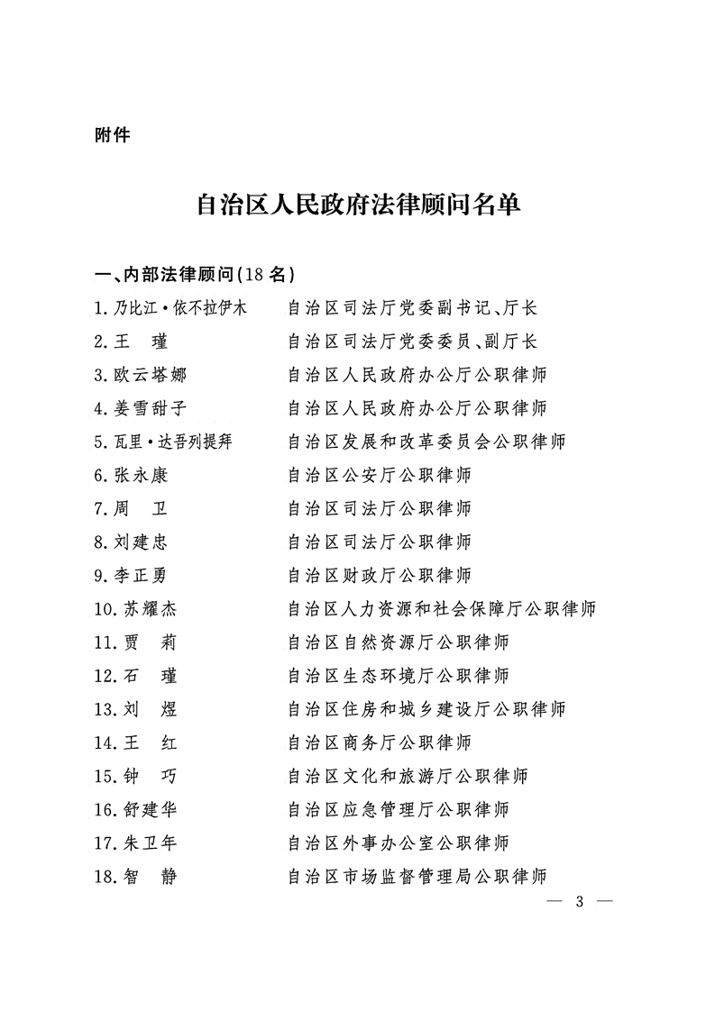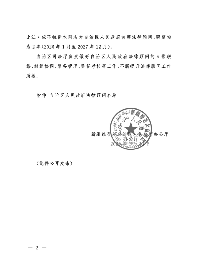 新疆维吾尔自治区人民政府办公厅关于聘任自治区人民政府法律顾问的通知