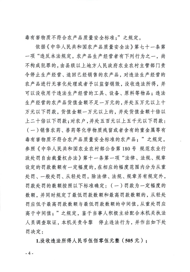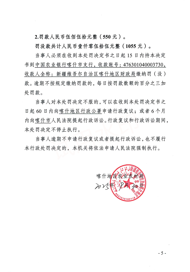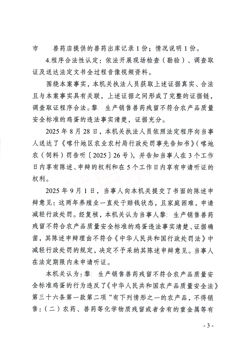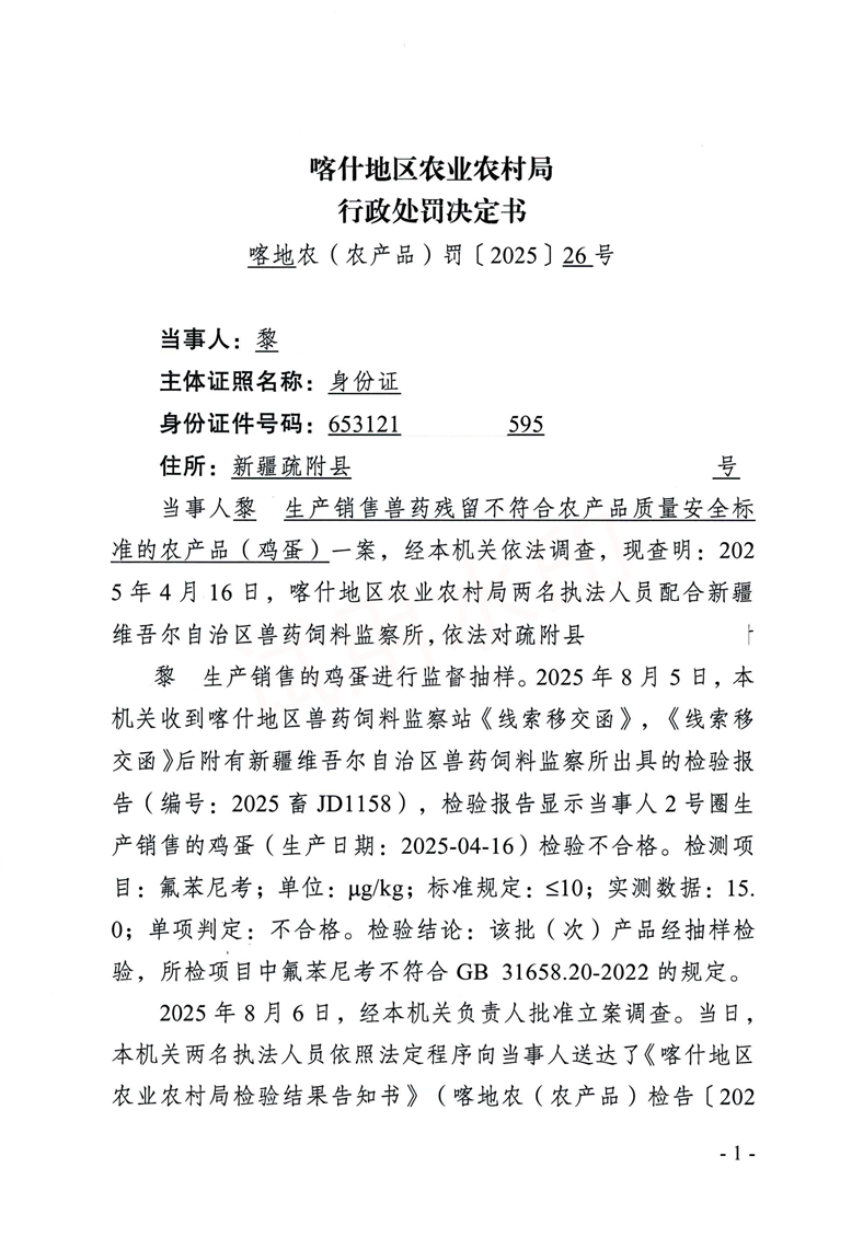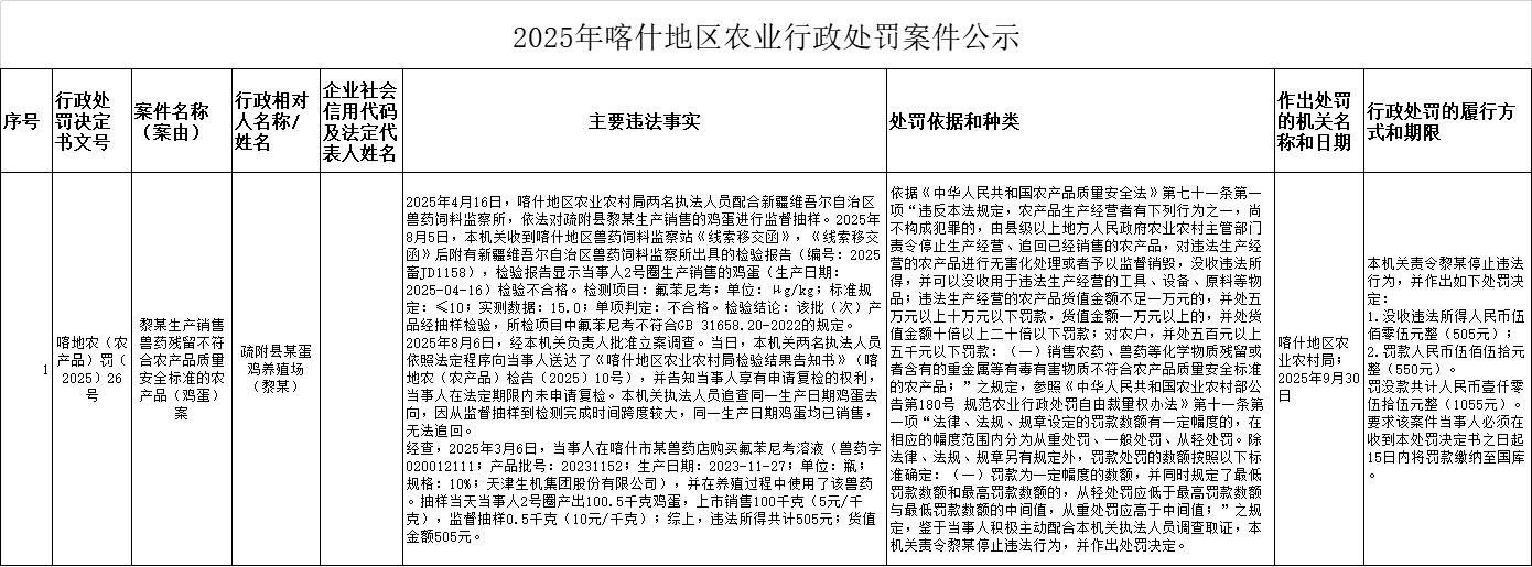 | 公开日期 | 2025-10-13 | 文号 | 喀地农(农产品)罚〔2025〕26号 |