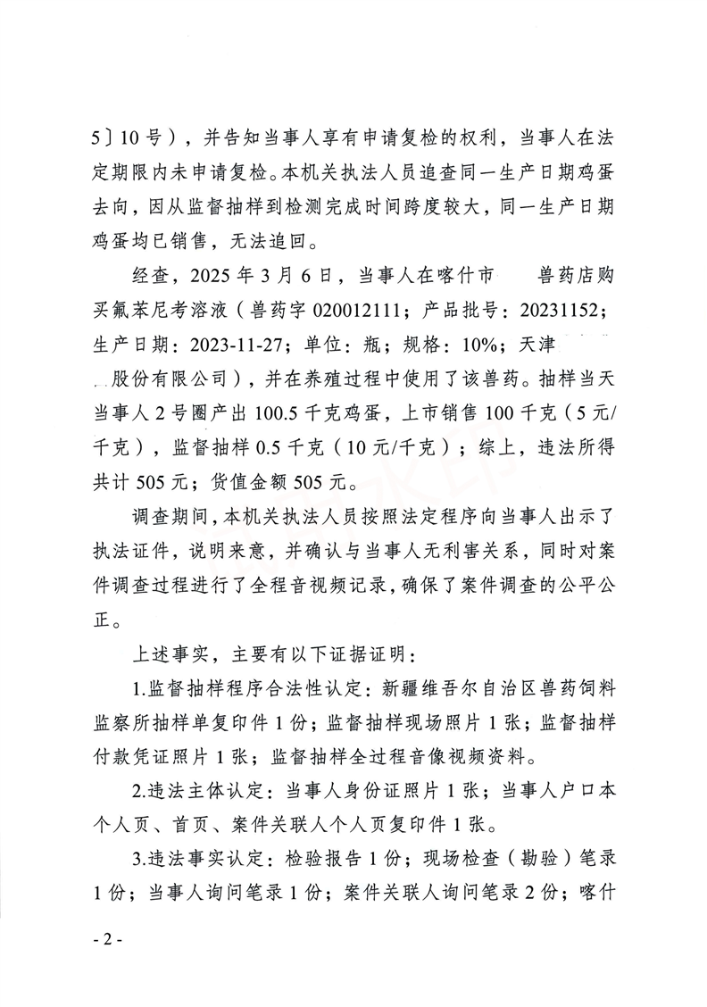 | 内容概述 | 主要违法事实:经查,2025年3月6日,当事人在喀什市某兽药店购买氟苯尼考溶液(兽药字020012111;产品批号:20231152;生产日期:2023-11-27;单位:瓶;规格:10%;天津生机集团股份有限公司),并在养殖过程中使用了该兽药。抽样当天当事人2号圈产出100.5千克鸡蛋,上市销售100千克(5元/千克),监督抽样0.5千克(10元/千克);综上,违法所得共计505元;货值金额505元。 | ||