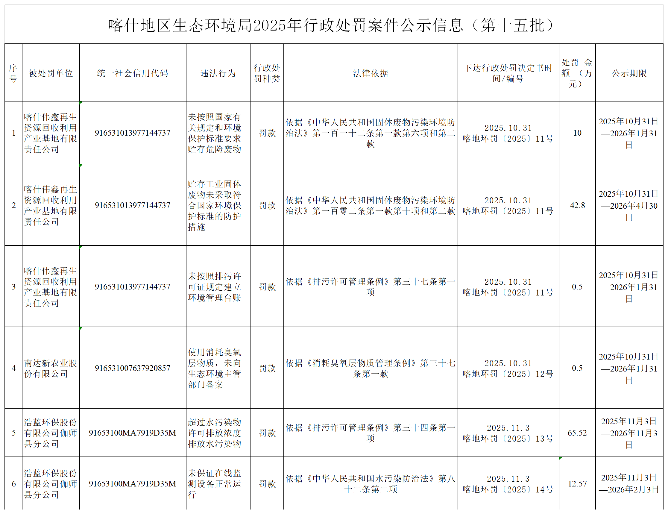 喀什地区生态环境局2025年行政处罚案件公示信息(第十五批)