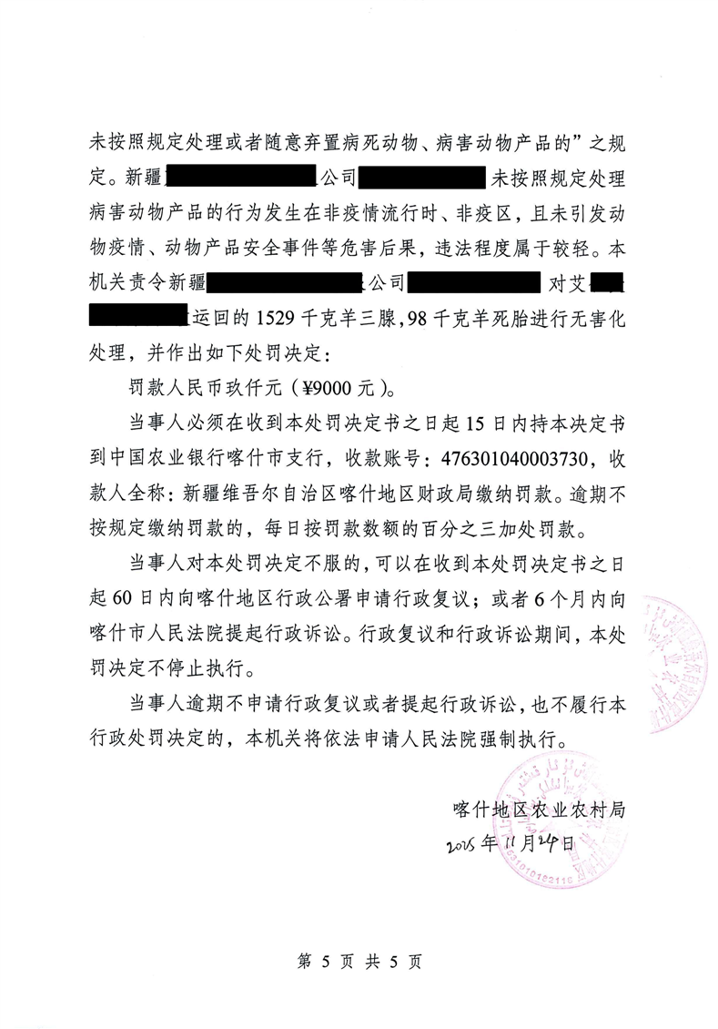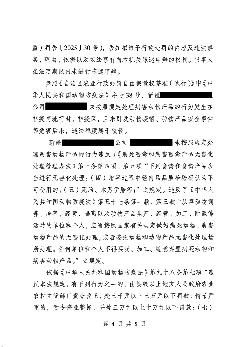 新疆某某有限公司未按照规定处理病害动物产品案