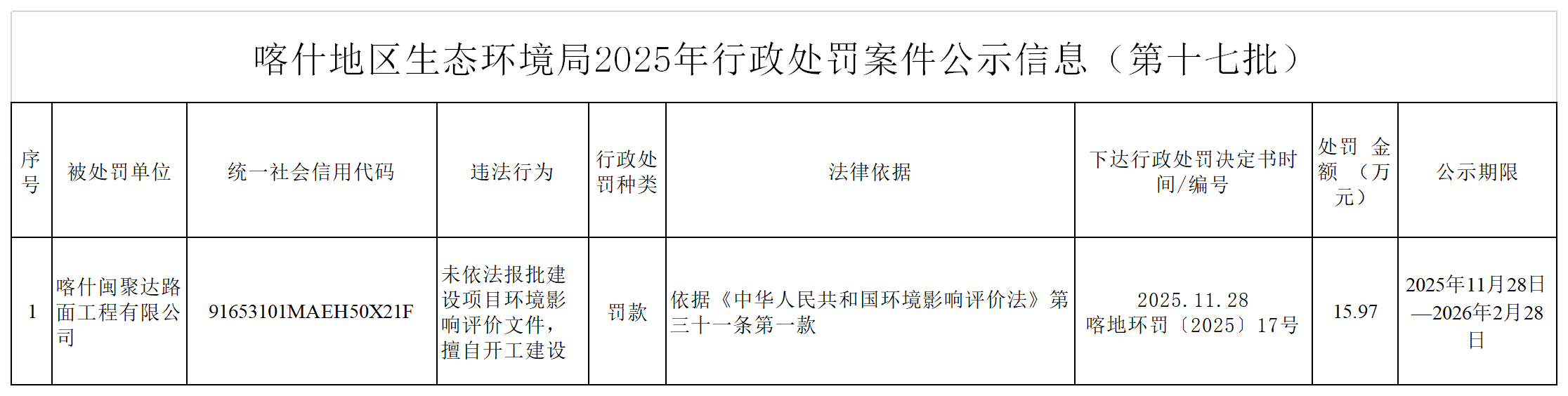 喀什地区生态环境局2025年行政处罚案件公示信息(第十七批)