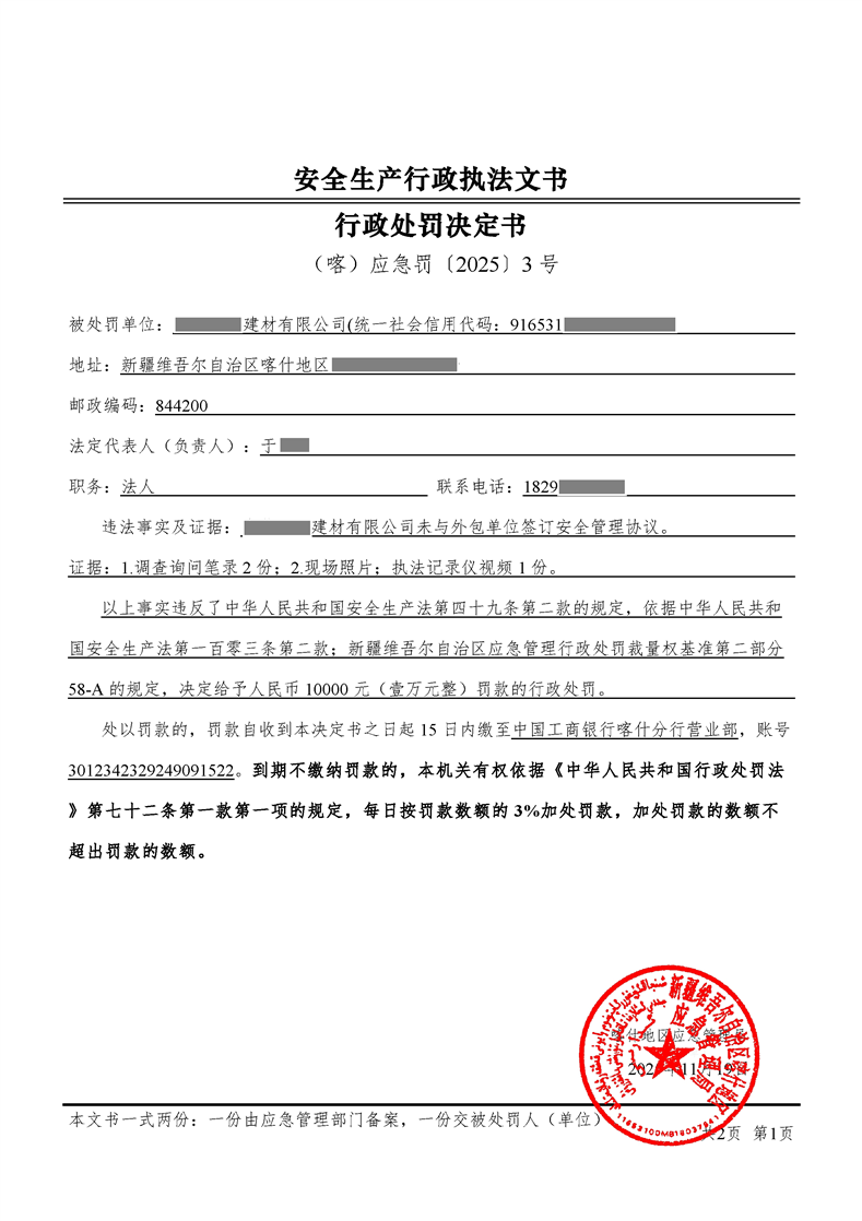 安全生产行政处罚决定书(喀)应急罚〔2025〕3号