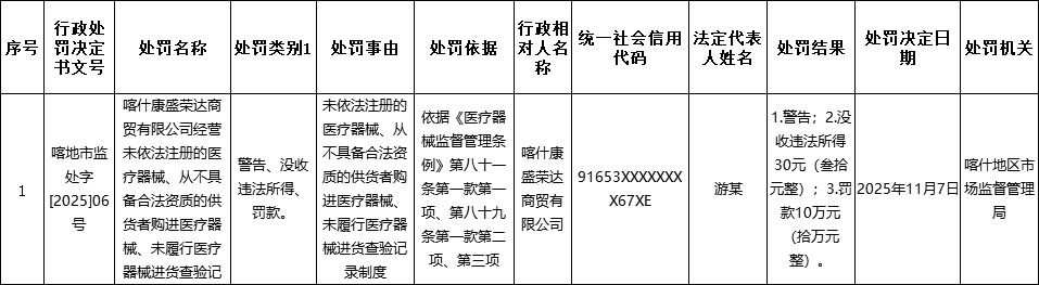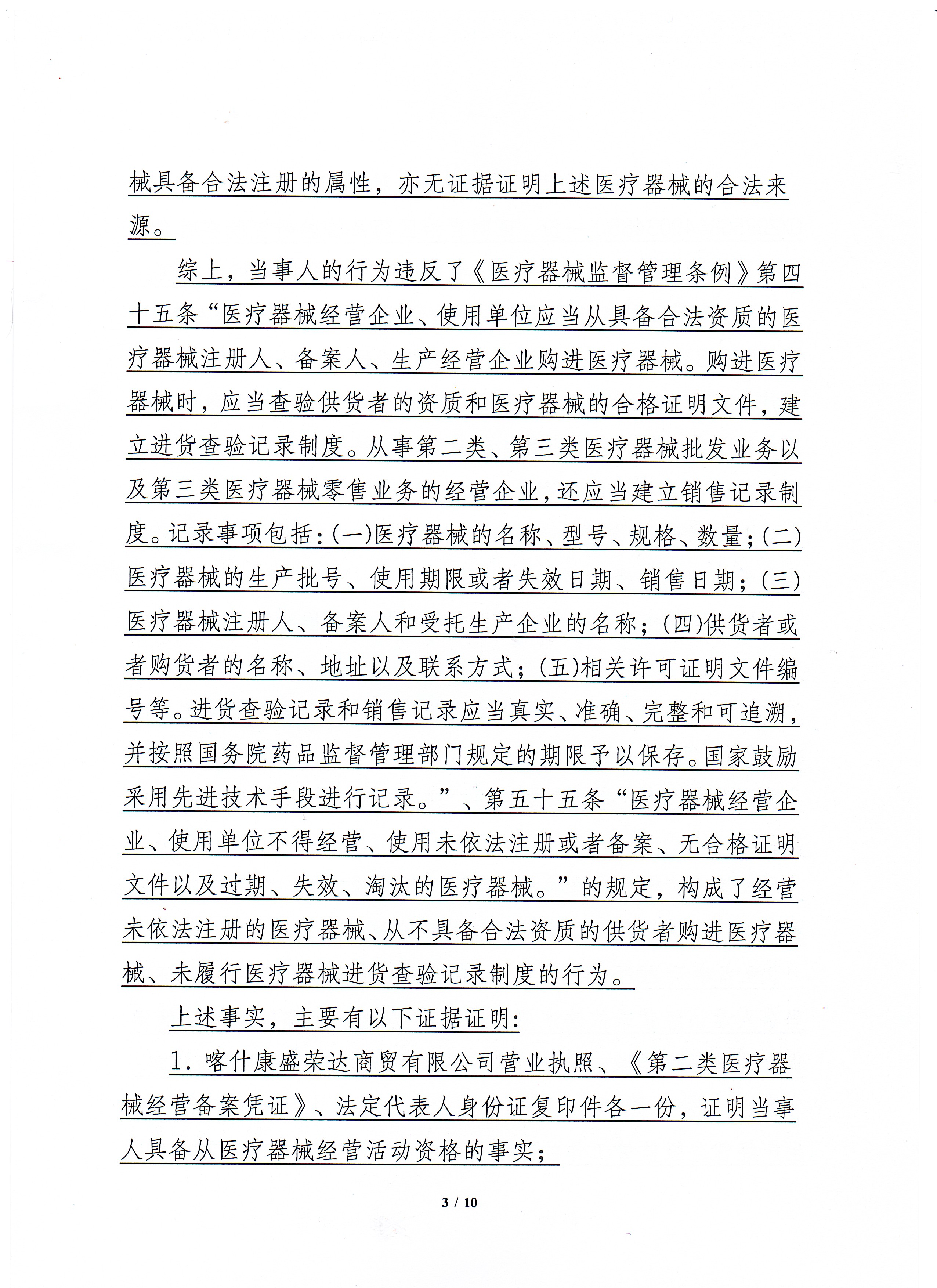 喀什康盛荣达商贸有限公司经营未依法注册的医疗器械、从不具备合法资质的供货者购进医疗器械、未履行医疗器械进货查验记录制度案