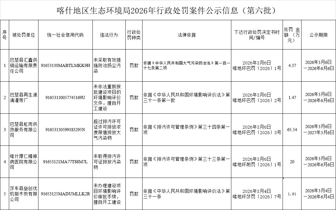 喀什地区生态环境局2026年行政处罚案件公示信息(第六批)