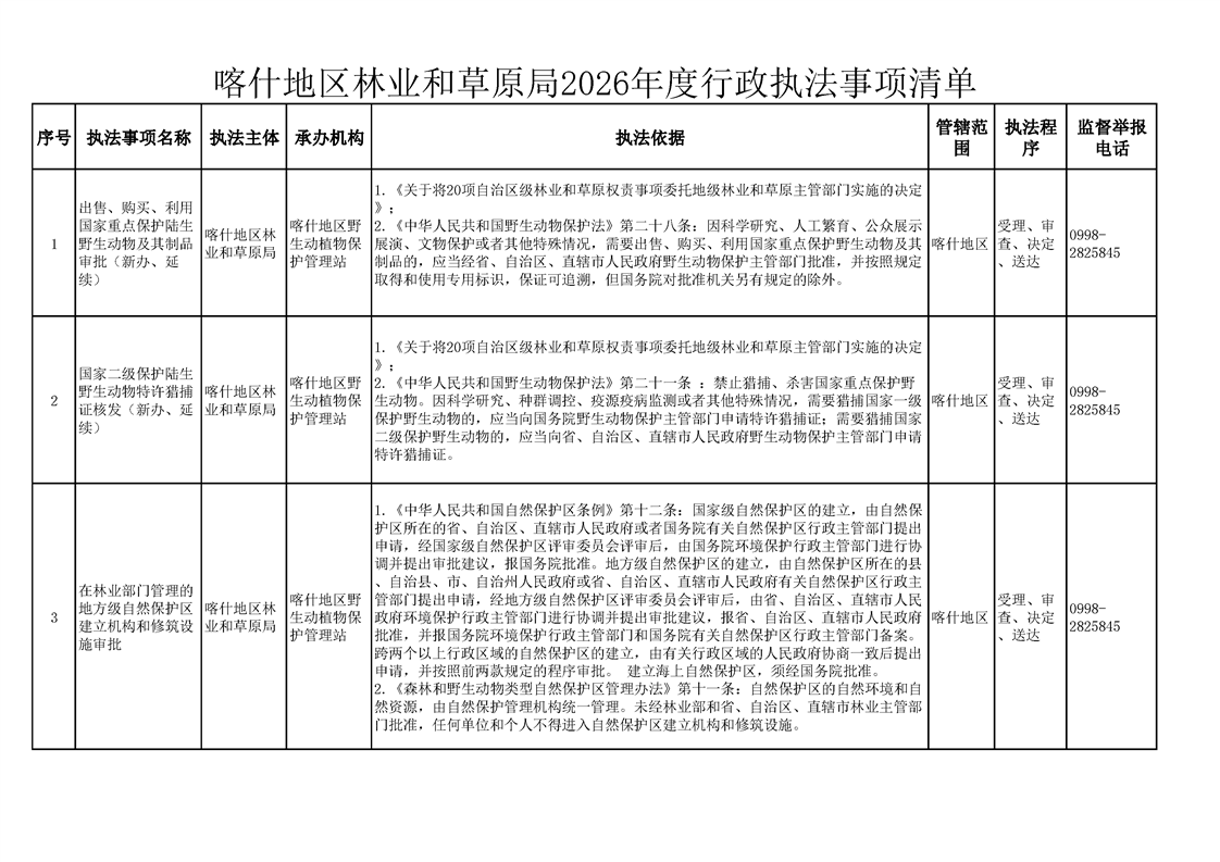 喀什地区林业和草原局2026年度行政执法事项清单